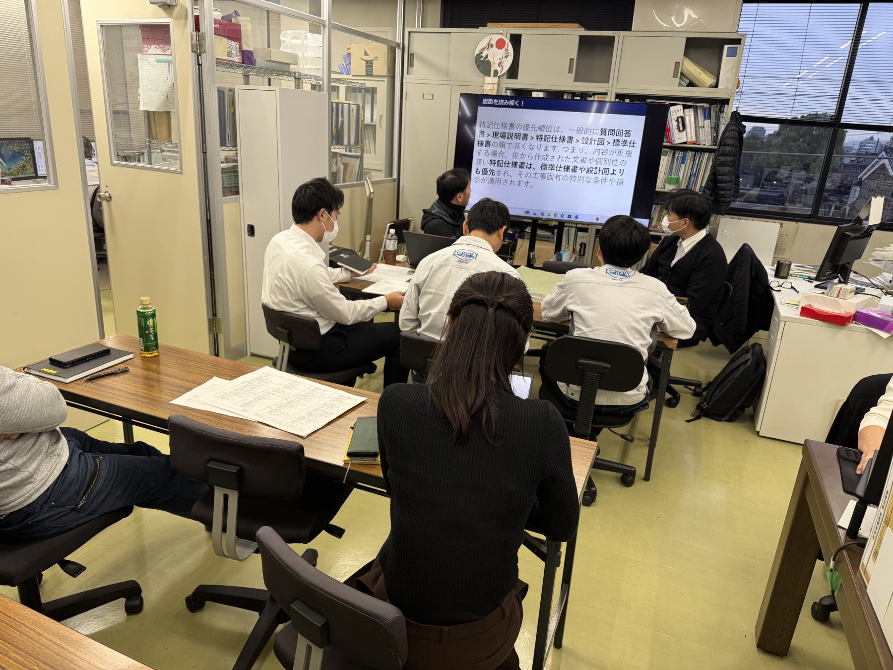 講義では、図面に記載されている情報の意味や読み取り方について、具体的な事例を交えながら解説が進められました。専門的な内容も多く、難しい部分もありましたが、日々の業務を振り返りながら学びを深める機会となりました。